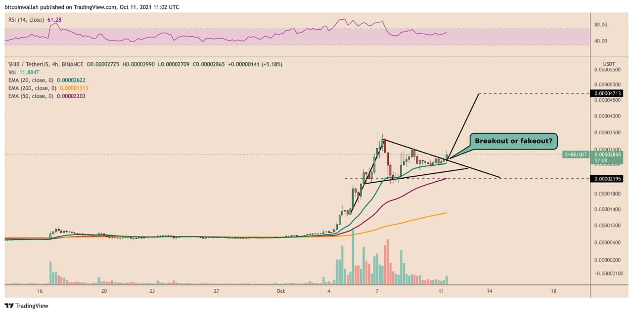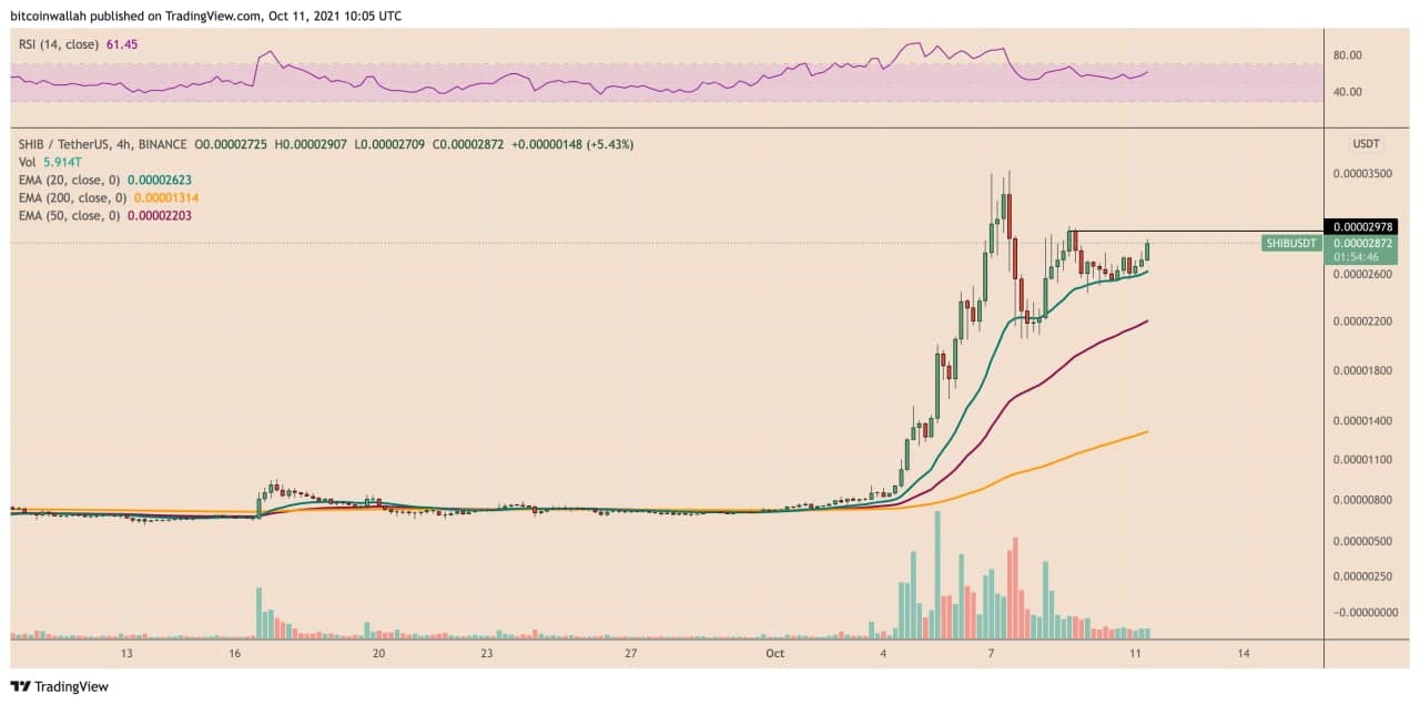 قیمت شیبا(SHIB) با ادامه 40 درصدی روند احیای خود در 11 اکتبر به سقف روزانه 0.00002907 دلار رسید. این میم کوین الهام گرفته از دوج کوین (DOGE) ، طبق نمودار زیر به دنبال یک صعود گسترده به سمت سطح مقاومتی تکنیکال خود در نزدیکی 0.00002978 دلار می باشد.