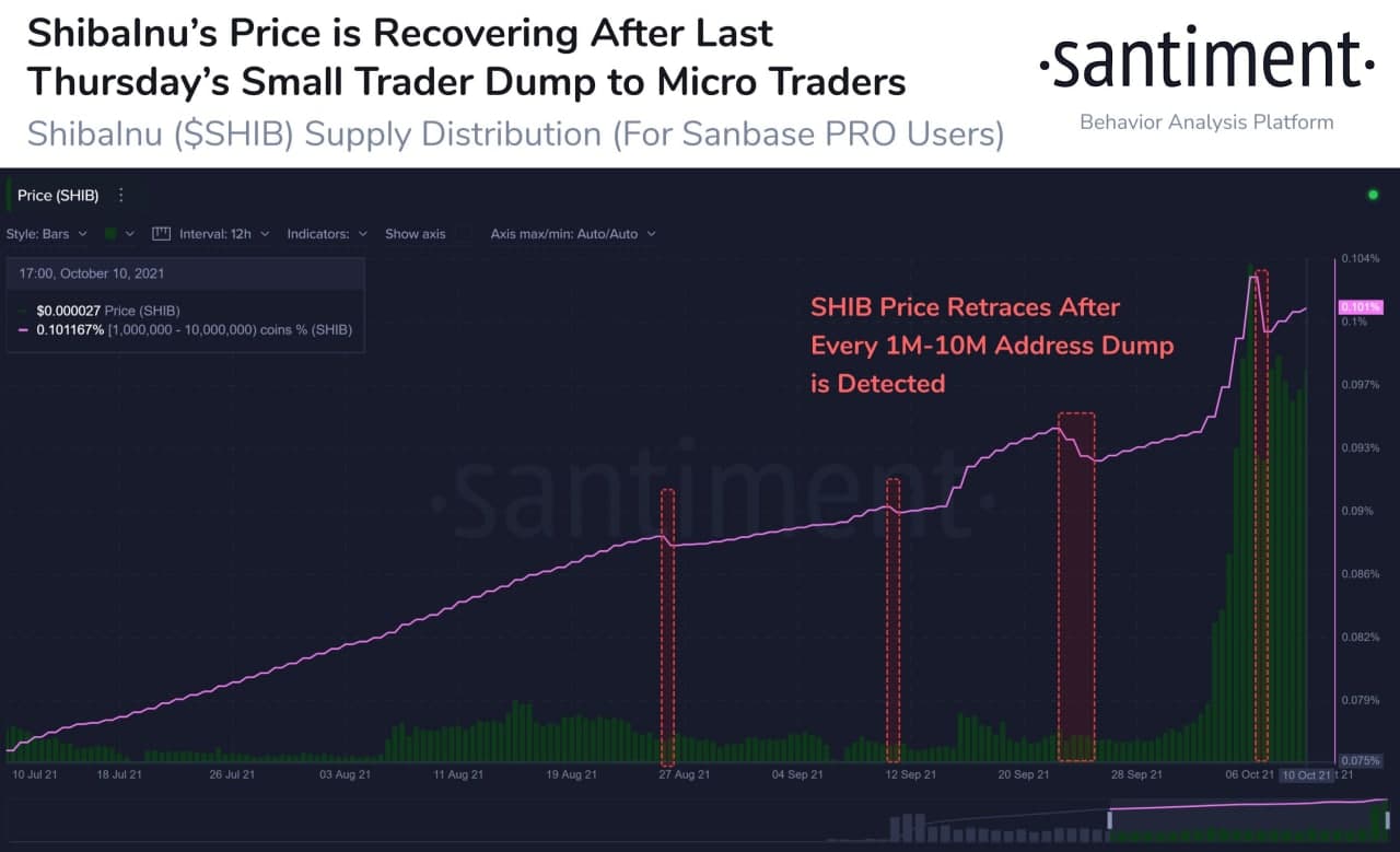 سنتیمنت اشاره کرد همانطور که در نمودار زیر نشان داده شده، قیمت شیبا اینو(SHIB) هر بار پس از فروش از سوی میلیونر های شیبا اینو (SHIB)، باز می گردد.