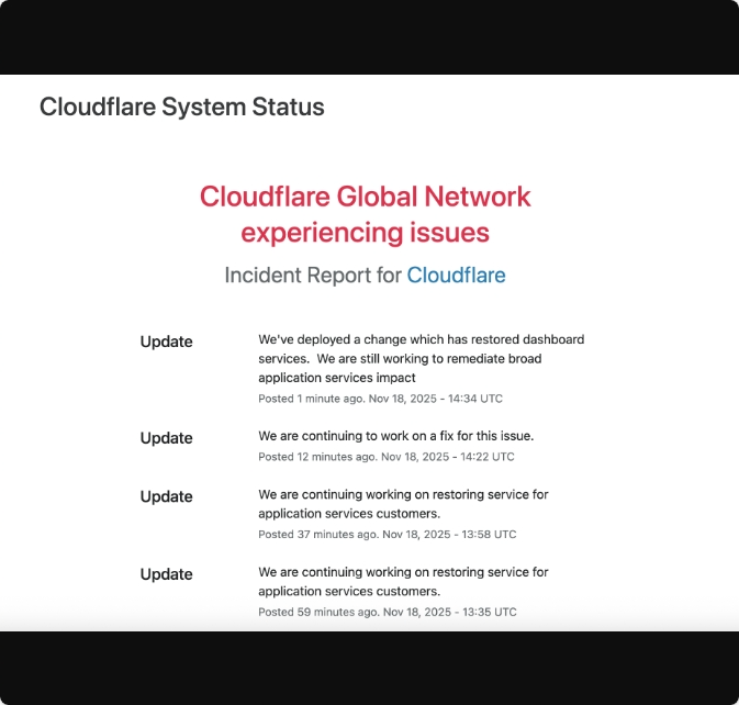 Cloudflare در بهروزرسانی روز سهشنبه وضعیت سیستم خود، اعلام کرد که پس از گزارش “کاهش خدمات داخلی” در ساعت ۱۱:۴۸ به وقت UTC، اصلاحاتی را انجام داده است.