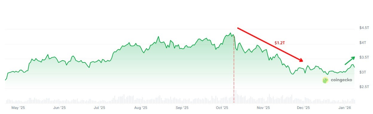 بر اساس دادههای CoinGecko، ارزش بازار کریپتو پس از سقوط اکتبر بیش از ۱.۲ تریلیون دلار کاهش یافت اما در ژانویه نشانههایی از بازیابی دیده میشود.