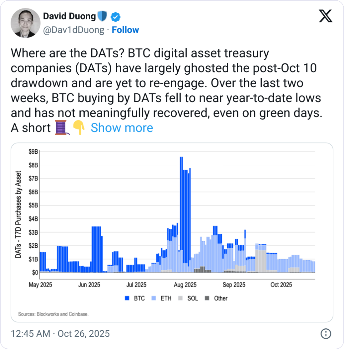 «شرکتهای خزانهی رمزارزی که بیتکوین خریداری میکردند، پس از افت ۱۰ اکتبر تقریباً ناپدید شدهاند و هنوز دوباره وارد بازار نشدهاند.»