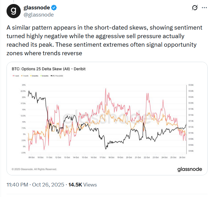 قیمت بیتکوین در آخر هفته با رشد قابل توجهی به حدود ۱۱۵ هزار دلار بازگشت. همزمان شاخص ترس و طمع بازار کریپتو سرانجام پس از سقوط اواسط اکتبر از محدوده «ترس» خارج و وارد وضعیت «خنثی» شد. همچنین پلتفرم تحلیلی Glassnode در گزارشی تازه اعلام کرد فشار فروش بیتکوین بهطور محسوسی کاهش یافته و نشانههای اولیه از بازگشت روند صعودی مشاهده میشود.