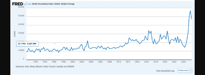شاخص عدم قطعیت جهانی که به شمارش ارجاعها به «عدم قطعیت» در گزارشهای کشوری اداره تحلیل اقتصاد جهانی (Economist Intelligence Unit) میپردازد، در بالاترین سطح خود در سری زمانی بانک فدرال رزرو سنت لوئیس (FRED) قرار دارد و بالاتر از اوجهای دیدهشده در دوران بحران مالی ۲۰۰۸ و شوک کووید-۱۹ در ۲۰۲۰ است.