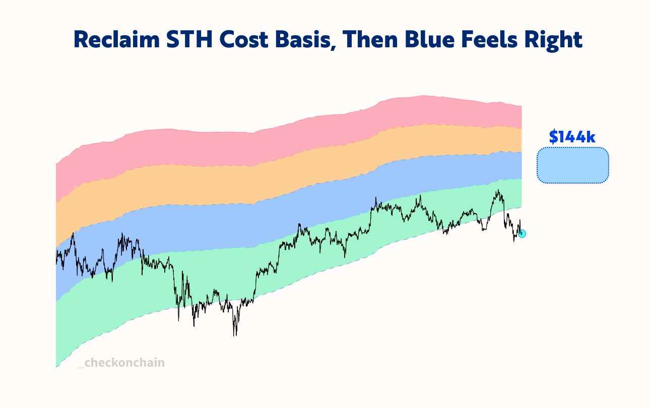 «اگر بیت‌کوین بتواند سطح هزینه‌ی هولدرهای کوتاه‌مدت را در ۱۱۳ هزار دلار پس بگیرد، حرکت بعدی به محدوده‌ی آبی ۱۳۰ تا ۱۴۴ هزار دلار محتمل است.»