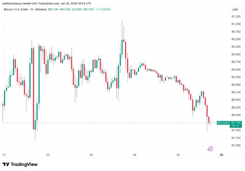 طبق دادههای TradingView قیمت بیت کوین با افت ۱.۶ درصدی به ۸۷٬۴۷۱ دلار در صرافی Bitstamp رسیده و در آستانه بستهشدن کندل هفتگی در پایینترین سطوح چند روز اخیر قرار گرفته است.