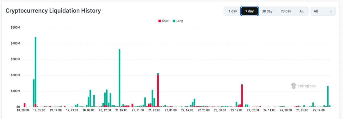 طبق دادههای CoinGlass، در ۲۴ ساعت گذشته بیش از ۲۵۰ میلیون دلار در بازار رمزارزها لیکویید شده که بخش عمده آن مربوط به پوزیشنهای لانگ بوده است.