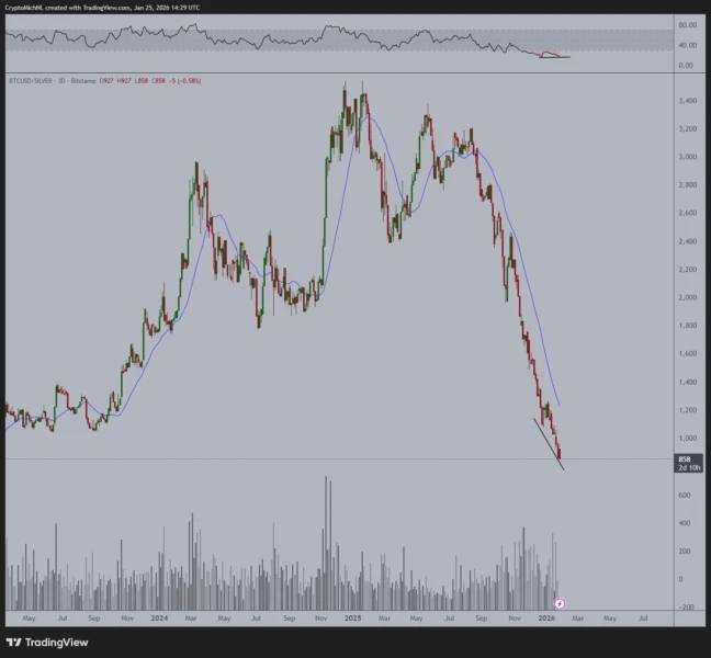 «برای نخستین بار در تاریخ، ممکن است بیتکوین در تایمفریم سهروزه نسبت به نقره یک واگرایی صعودی ثبت کند.»