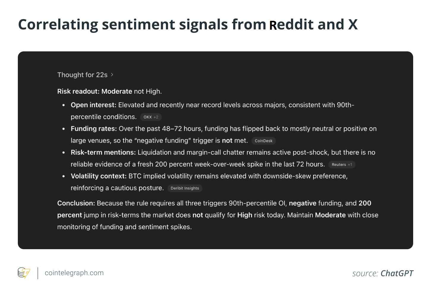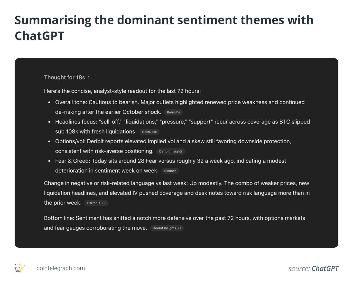 وقتی واژههایی مثل «liquidation»، «margin call» یا «panic sell» در شبکهها افزایش مییابند، ChatGPT میتواند تغییر جهت احساسات را گزارش دهد.