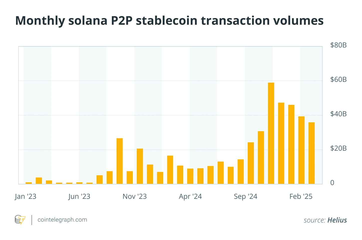 در ژانویه ۲۰۲۵، حجم تراکنش‌های P2P استیبل‌کوینی در سولانا به ۵۹.۲ میلیارد دلار رسید و موجودی USDC در شبکه به ۹.۳۵ میلیارد دلار افزایش یافت. مجموع عرضه استیبل‌کوین‌های سولانا نیز در دو ماه اول سال از ۵.۲ به ۱۱.۷ میلیارد دلار رسید.