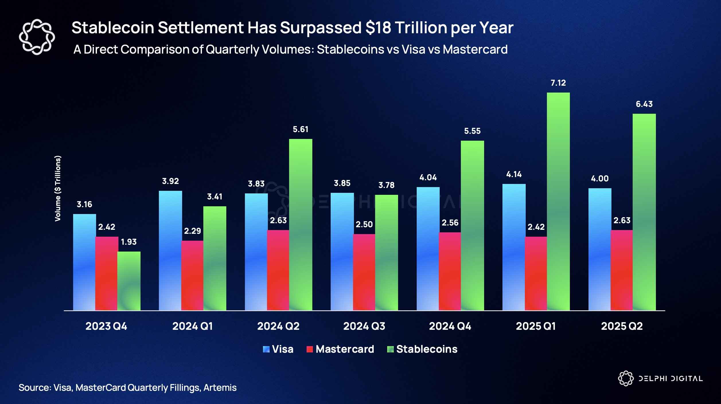 • حجم تسویه معاملات سالانه استیبل‌کوین‌ها به بیش از ۱۸ تریلیون دلار رسیده که حتی از شبکه‌های پرداخت سنتی مانند Visa و Mastercard بالاتر است.