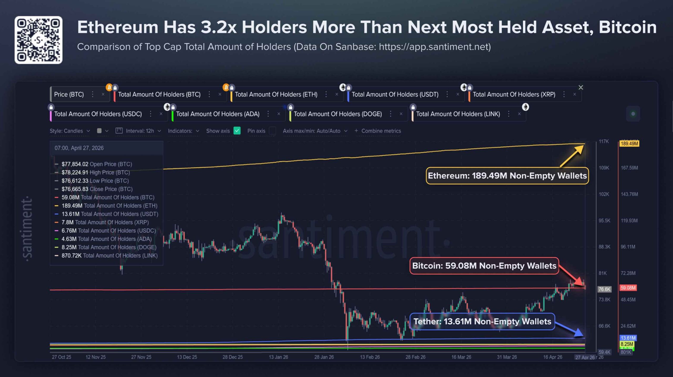 بر اساس تحلیل Santiment، شاخص «تعداد کل هولدرها» که تعداد آدرسهای دارای موجودی غیر صفر را نشان میدهد برای اتریوم به حدود ۱۸۹.۵ میلیون آدرس رسیده است. در حالی که اتریوم روندی صعودی در جذب کاربران دارد، بیت کوین در ماههای اخیر رشد قابلتوجهی در این شاخص نداشته و تعداد هولدرهای بیت کوین حدود ۵۹.۱ میلیون است.
