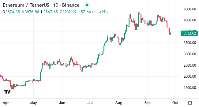 در زمان نگارش این مطلب، اتریوم با قیمت ۴۰۰۶ دلار معامله می‌شود که نشان‌دهنده کاهش قیمت ۰.۳۲٪ و ۱۰.۷٪ به ترتیب در یک و هفت روز گذشته است. در همین حال، حجم معاملات این دارایی ۵۷.۴۹٪ کاهش یافته و اکنون ۲۱.۶۶ میلیارد دلار است. احتمالاً اتریوم با شروع سه‌ماهه چهارم، روند صعودی فعلی خود را حفظ خواهد کرد.