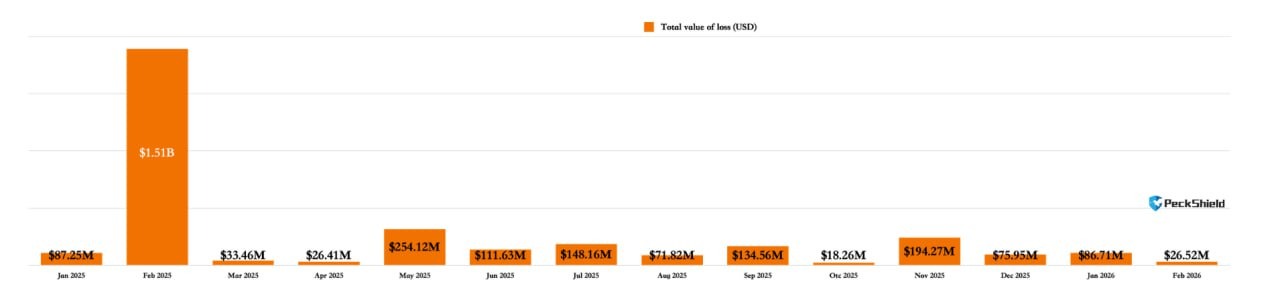 بر اساس گزارش شرکت امنیت بلاکچین PeckShield، مجموع خسارتهای ناشی از هکها و کلاهبرداریهای کریپتویی در ماه فوریه به ۲۶.۵ میلیون دلار رسید. رقمی که پایینترین سطح از مارس ۲۰۲۵ تاکنون محسوب میشود.