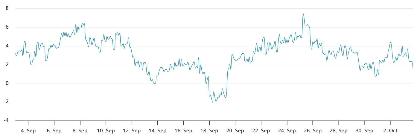 قراردادهای آتی ۶۰روزه اتریوم با پریمیوم سالانه ۷٪ نسبت به بازار اسپات معامله میشوند. رقمی که در محدوده خنثی ۵ تا ۱۰ درصد قرار دارد و صرفاً هزینه تسویهحساب طولانیتر را جبران میکند.