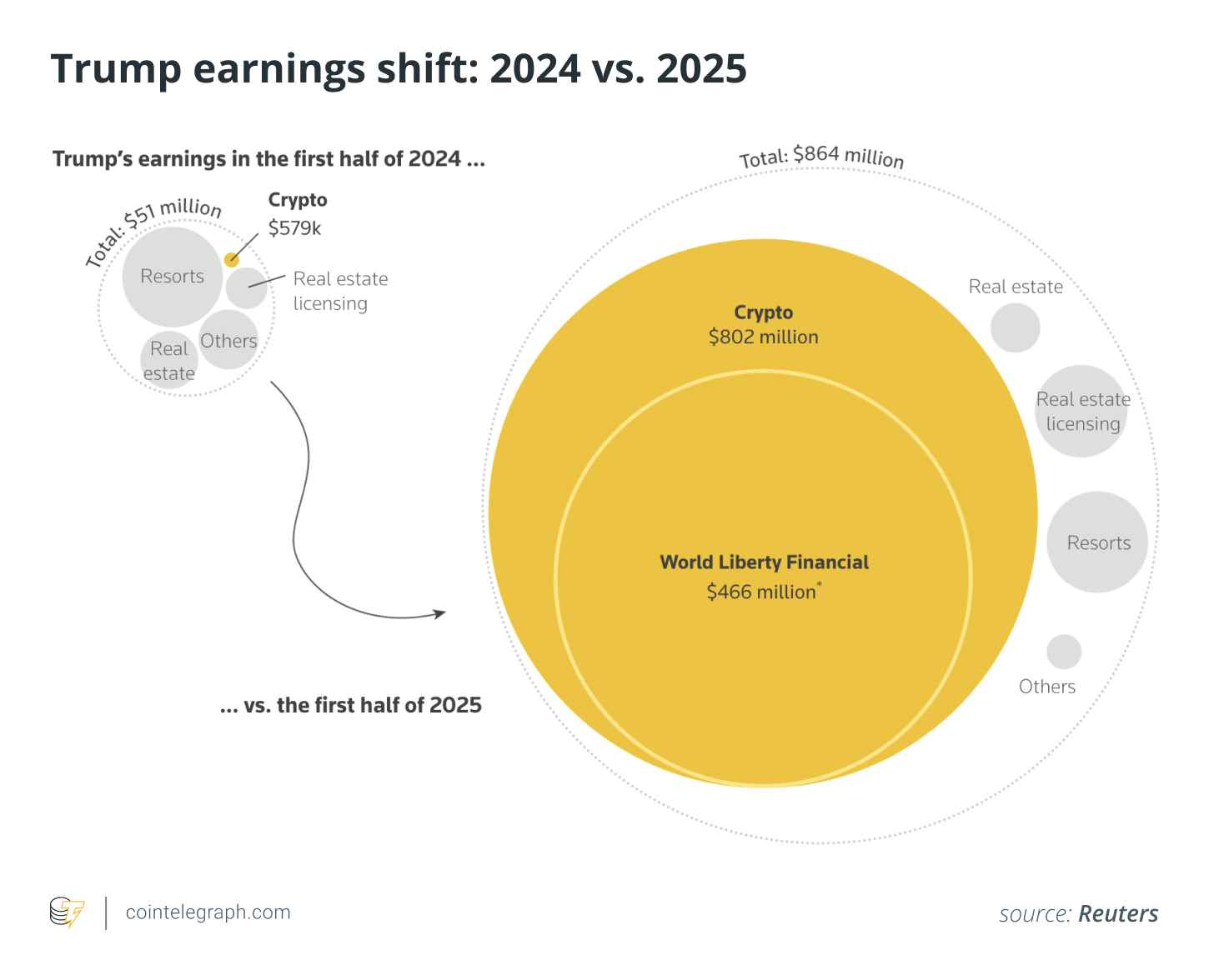 در نیمه نخست ۲۰۲۵، خانواده ترامپ با استفاده از پروژههای رمزارزی مانند WLFI، TRUMP Coin و استیبلکوین USD1 بیش از ۸۰۰ میلیون دلار درآمد کسب کردند. سودی که همزمان با نرمتر شدن نظارت دولت بر صنعت کریپتو، نگرانیهایی درباره تعارض منافع میان سیاست و ثروت دیجیتال ایجاد کرده است.