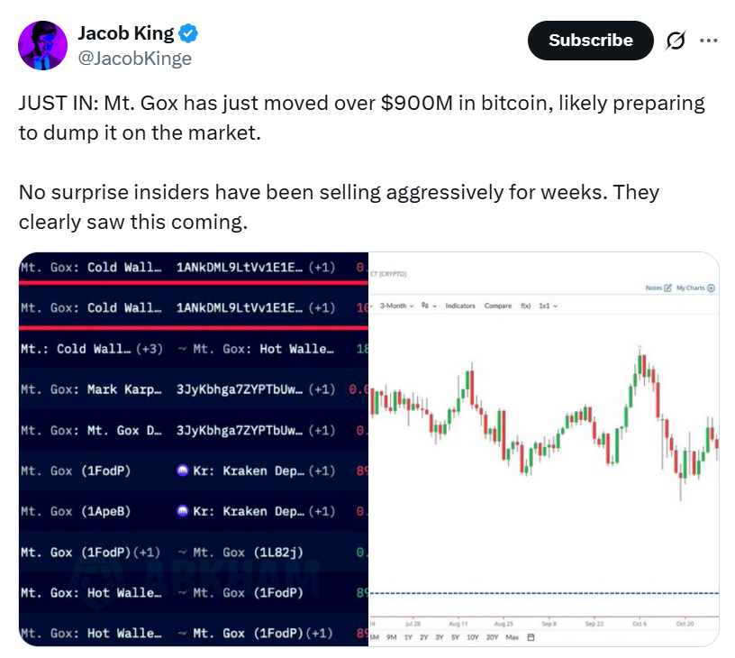 کیف پول Mt. Gox روز سهشنبه حدود ۱۰,۶۰۸ بیتکوین به ارزش تقریبی ۹۵۳ میلیون دلار را به یک کیف پول جدید منتقل کرد. این نخستین تراکنش بزرگ این صرافی از ماه مارس محسوب میشود. در حال حاضر، Mt. Gox همچنان بیش از ۳۴,۶۸۹ بیتکوین در اختیار دارد که ارزش آن حدود ۳.۱۴ میلیارد دلار برآورد میشود. این انتقال در حالی انجام شد که Mt. Gox اخیراً در اطلاعیهای رسمی از تعویق بازپرداخت طلبکاران تا ۳۱ اکتبر ۲۰۲۶ خبر داد و دلیل آن را «ناقص بودن مراحل اداری طلبکاران» اعلام کرد.