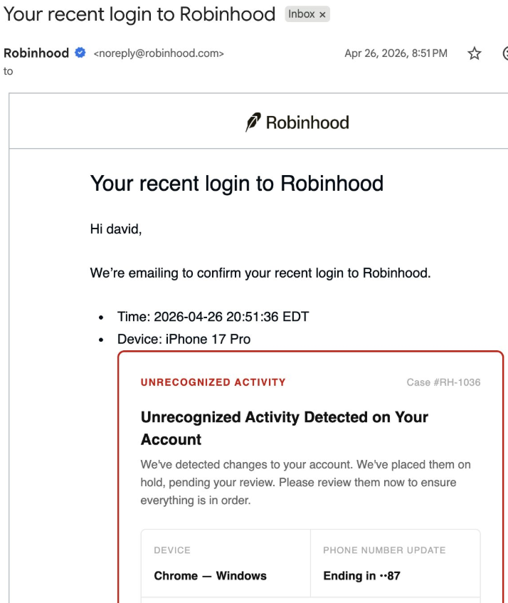 در نتیجه، ایمیلی واقعی از آدرس رسمی noreply@robinhood.com ارسال میشود که تمام استانداردهای امنیتی مانند SPF، DKIM و DMARC را پاس میکند، اما حاوی متن هشدار جعلی و دکمه فیشینگ است.