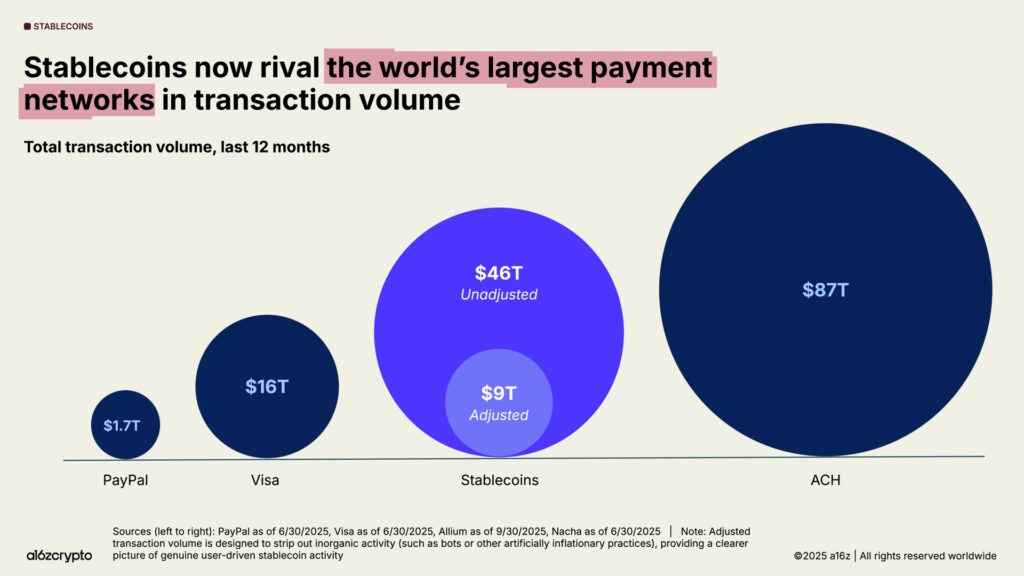 گزارش جدید شرکت Andreessen Horowitz (a16z) نشان میدهد در ۱۲ ماه گذشته، ارزش تراکنش استیبلکوینها به ۹ تریلیون دلار رسیده که افزایشی ۸۷ درصدی نسبت به سال قبل داشته است. در مقیاس کل حجم تراکنشها به ۴۶ تریلیون دلار افزایش یافته است. یکی از نکات کلیدی گزارش این است که استیبلکوینها به یک «نیروی کلاناقتصادی در جهان» تبدیل شدهاند. بنا بر دادههای a16z، بیش از ۱٪ از کل دلارهای در گردش جهان اکنون بهصورت استیبلکوینهای مبتنی بر بلاکچین عمومی در دسترس قرار دارند.
