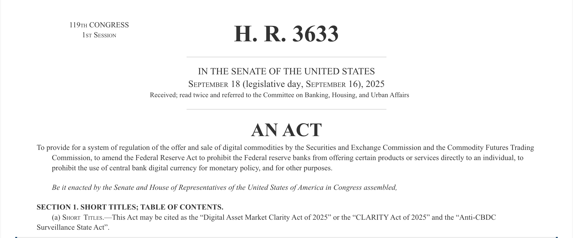 در همین حال، مقررات مربوط به استیبلکوینها به موضوعی بحثبرانگیز در واشنگتن تبدیل شده است. یکی از مهمترین طرحها در این زمینه قانون ساختار بازار کریپتو با نام CLARITY Act است.