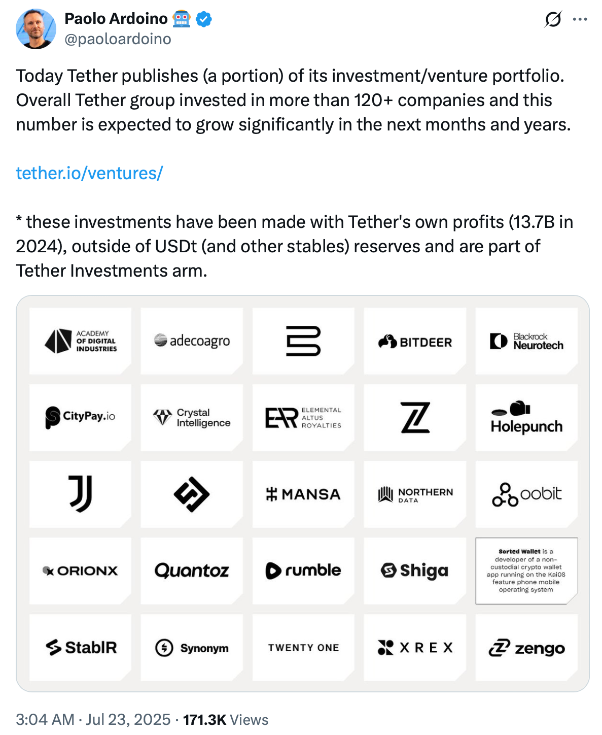 پائولو آردوینو (Paolo Ardoino)، مدیرعامل Tether، اعلام کرده که این شرکت از طریق بخش سرمایهگذاری خود در بیش از ۱۲۰ شرکت سرمایهگذاری کرده است. نکته مهم این است که این سرمایهگذاریها از سود شرکت تأمین شدهاند، نه از ذخایر استیبلکوینها.
