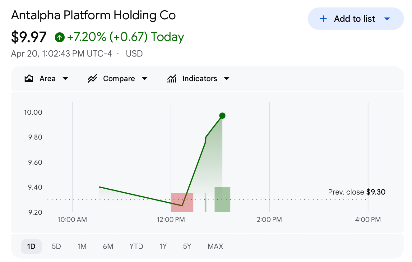 پس از انتشار خبر سرمایهگذاری تتر، سهام Antalpha در معاملات اولیه حدود ۷.۲٪ رشد کرد و به حدود ۹.۹۷ دلار رسید.