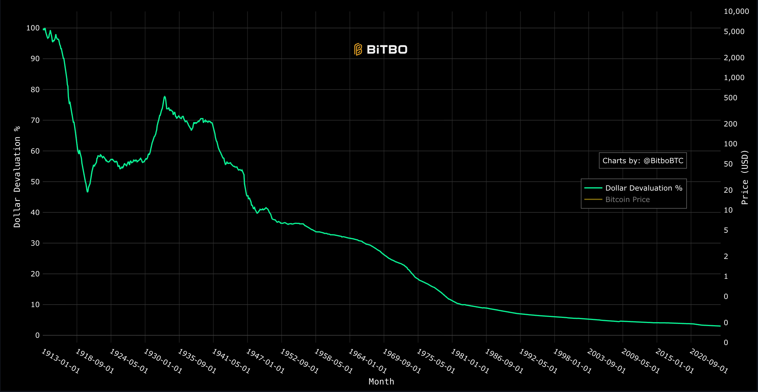 طبق دادههای BitBo، دلار آمریکا از سال ۱۹۱۳ تاکنون بیش از ۹۰ درصد ارزش خود را از دست داده است.