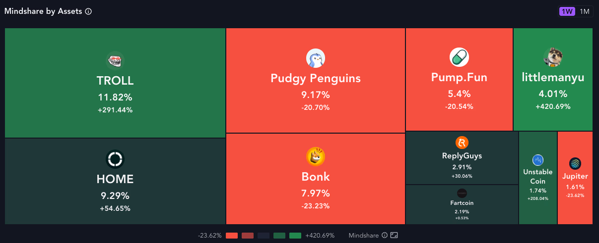 رشد انفجاری قیمت TROLL برای بسیاری از معاملهگران فعال و ریسکپذیر غافلگیرکننده بوده است. در نتیجه، این توکن اکنون توجه بسیاری را در اکوسیستم سولانا به خود جلب کرده است. طبق دادههای Messari Portals، ترول در هفته گذشته نزدیک به ۱۲٪ از کل سهم اکوسیستم سولانا را به خود اختصاص داده است؛ عددی که نشاندهنده تمرکز قابلتوجه جامعه بر این میمکوین است.
