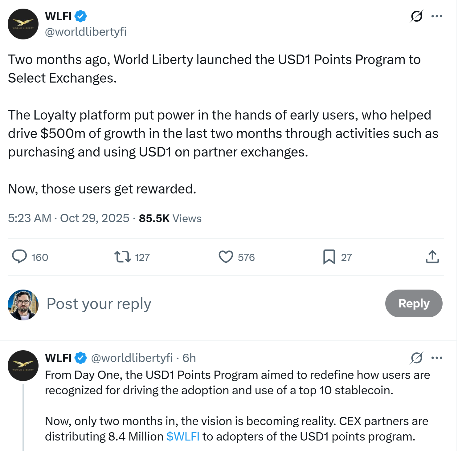 این ایردراپ قرار است پاداشی برای کاربرانی باشد که در برنامه امتیازدهی USD1 Points Program شرکت کردهاند. برنامهای که دو ماه پیش برای افزایش پذیرش استیبلکوین دلاری ورلد لیبرتی راهاندازی شد. کاربران از طریق معامله جفتارزهای USD1 در صرافیها و نگهداری موجودی در حسابها امتیاز کسب کردهاند. ورلد لیبرتی در اطلاعیه روز چهارشنبه در شبکه اجتماعی X اعلام کرد: «معیارهای کسب امتیاز و پاداش، و جزئیات توزیع ممکن است بسته به قوانین هر صرافی متفاوت باشد.» طبق این بیانیه، توزیع اولیه WLFI در شش صرافی بزرگ انجام میشود: Gate.io، KuCoin، LBank، HTX Global، Flipster و MEXC.