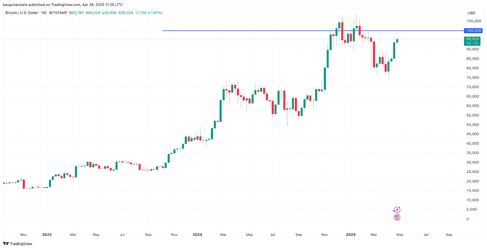 بیت کوین با شروع هفته 28 آوریل با 10 درصد افزایش در 7 روز گذشته قدرت خود را به نمایش گذاشت و به 95500 دلار رسید.